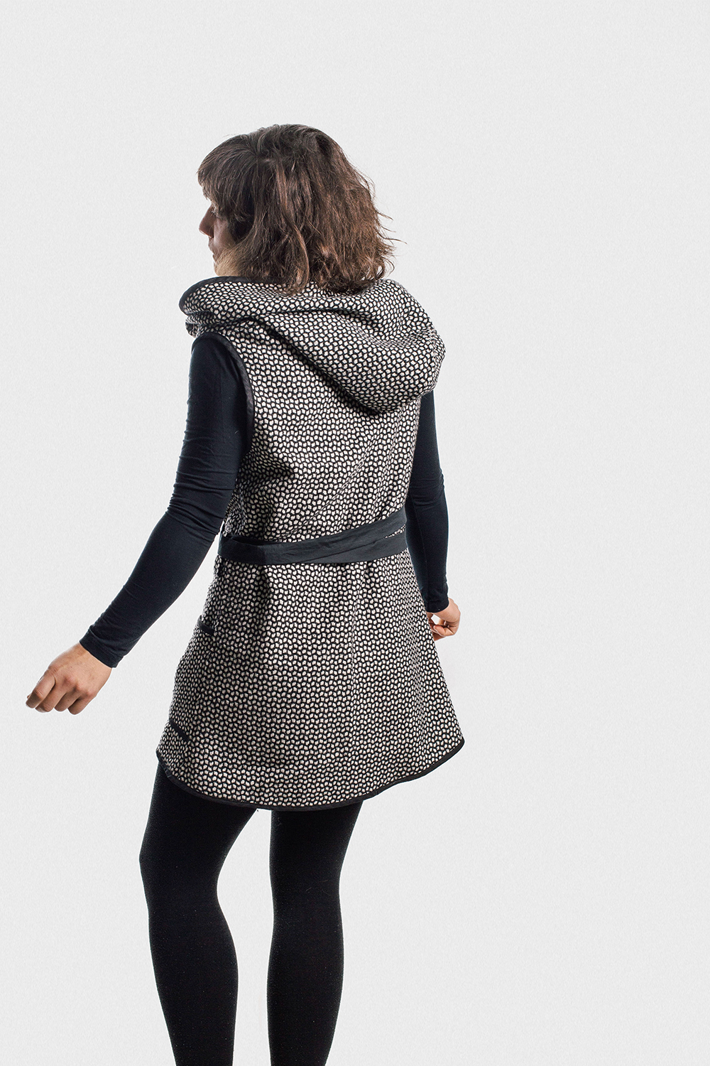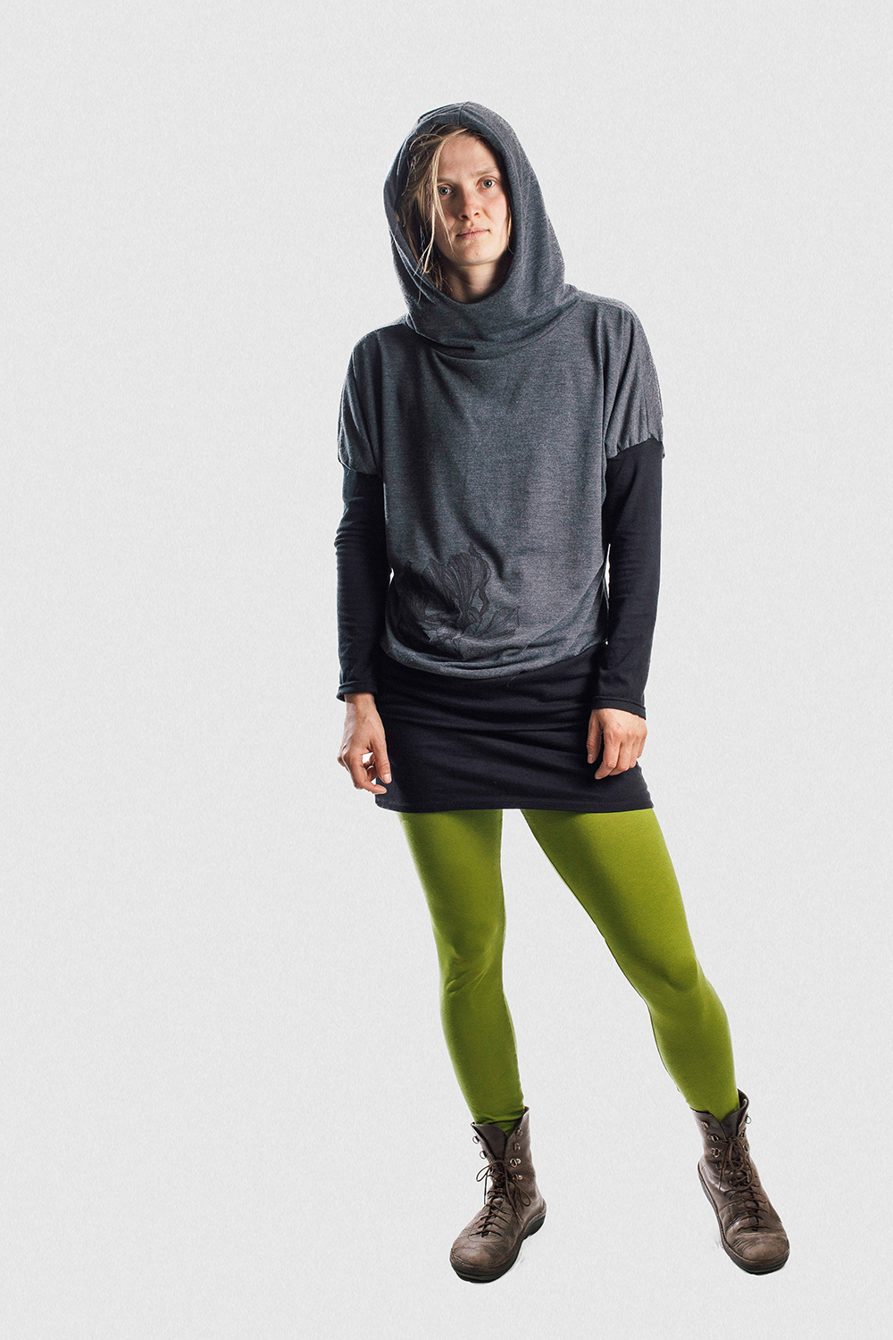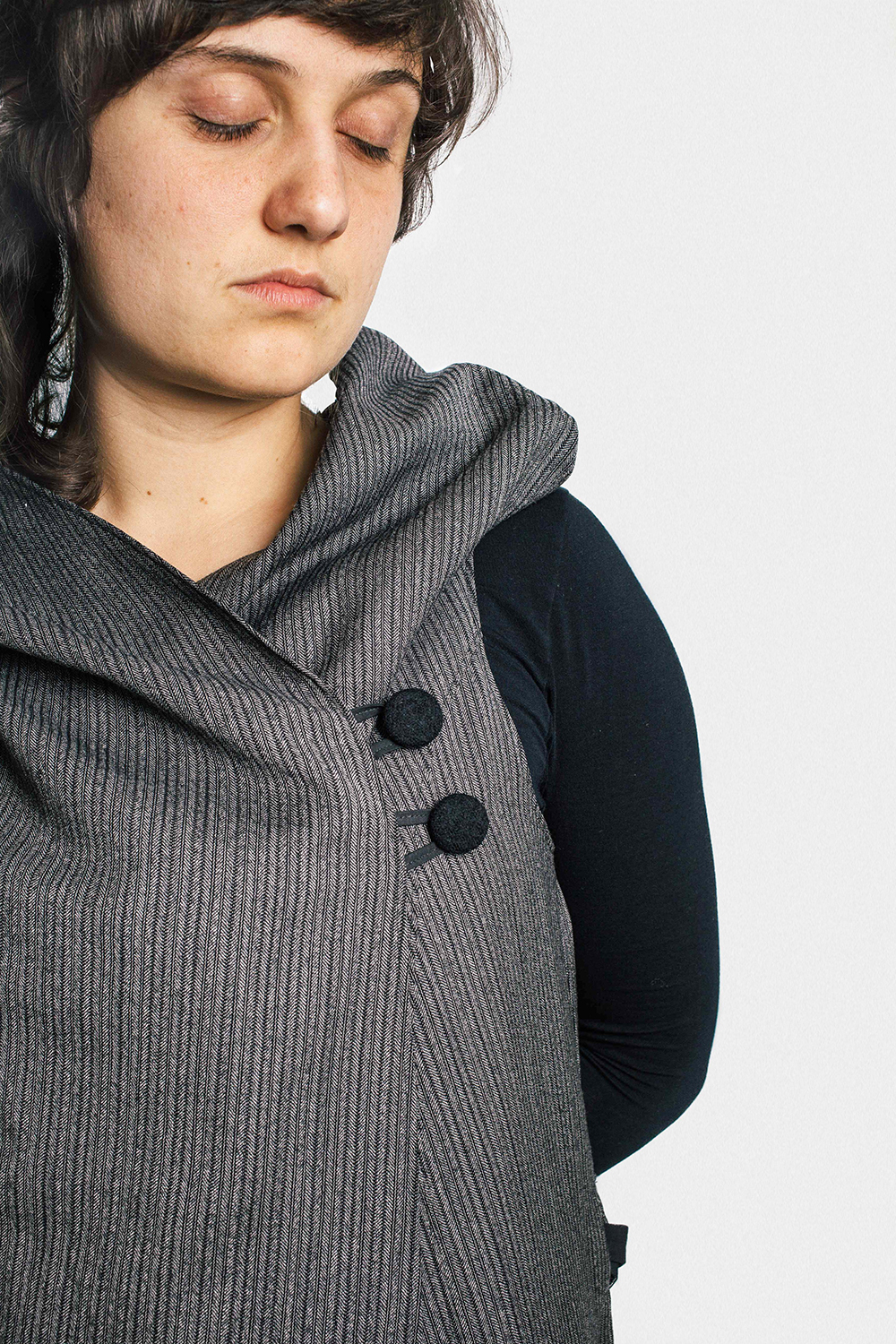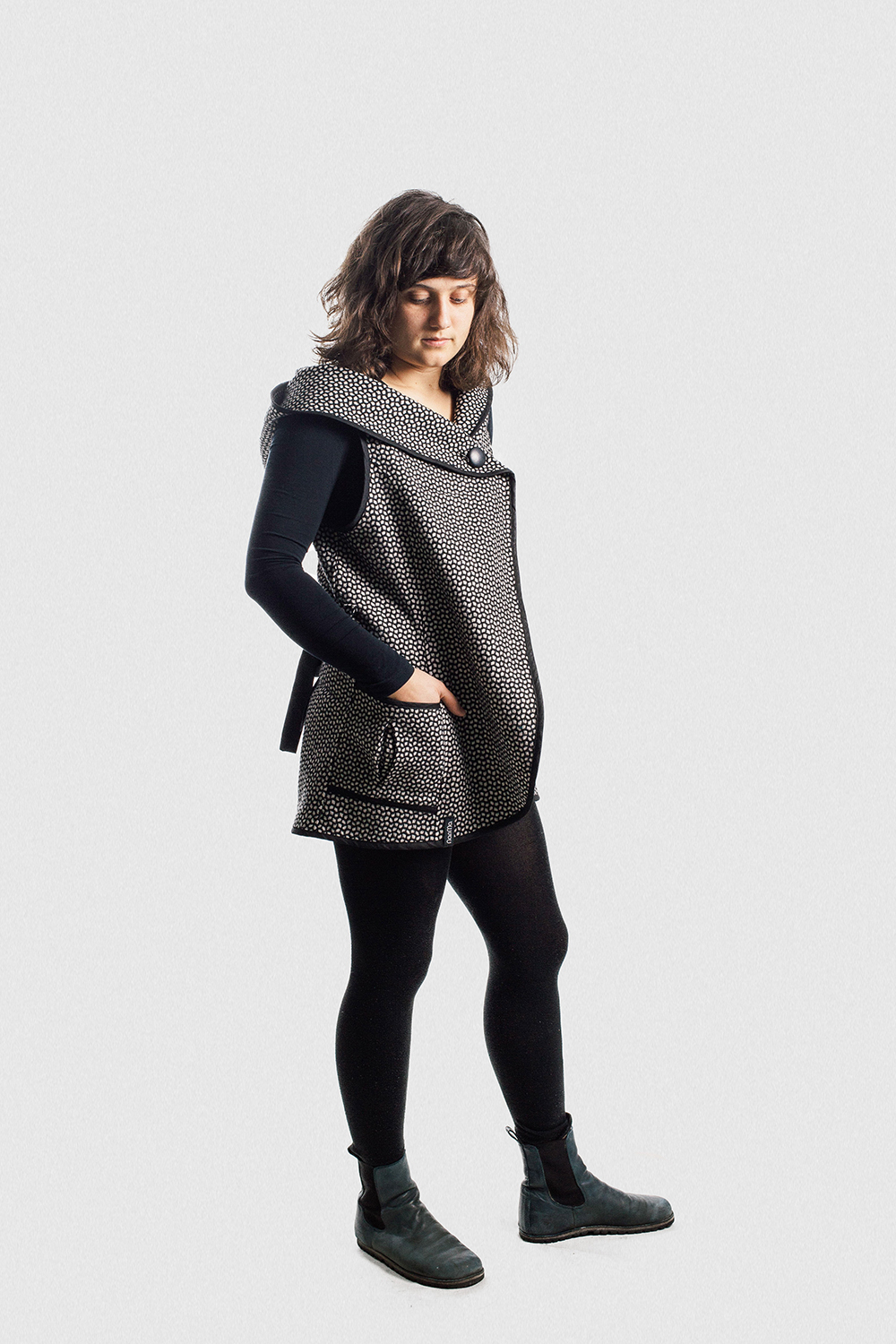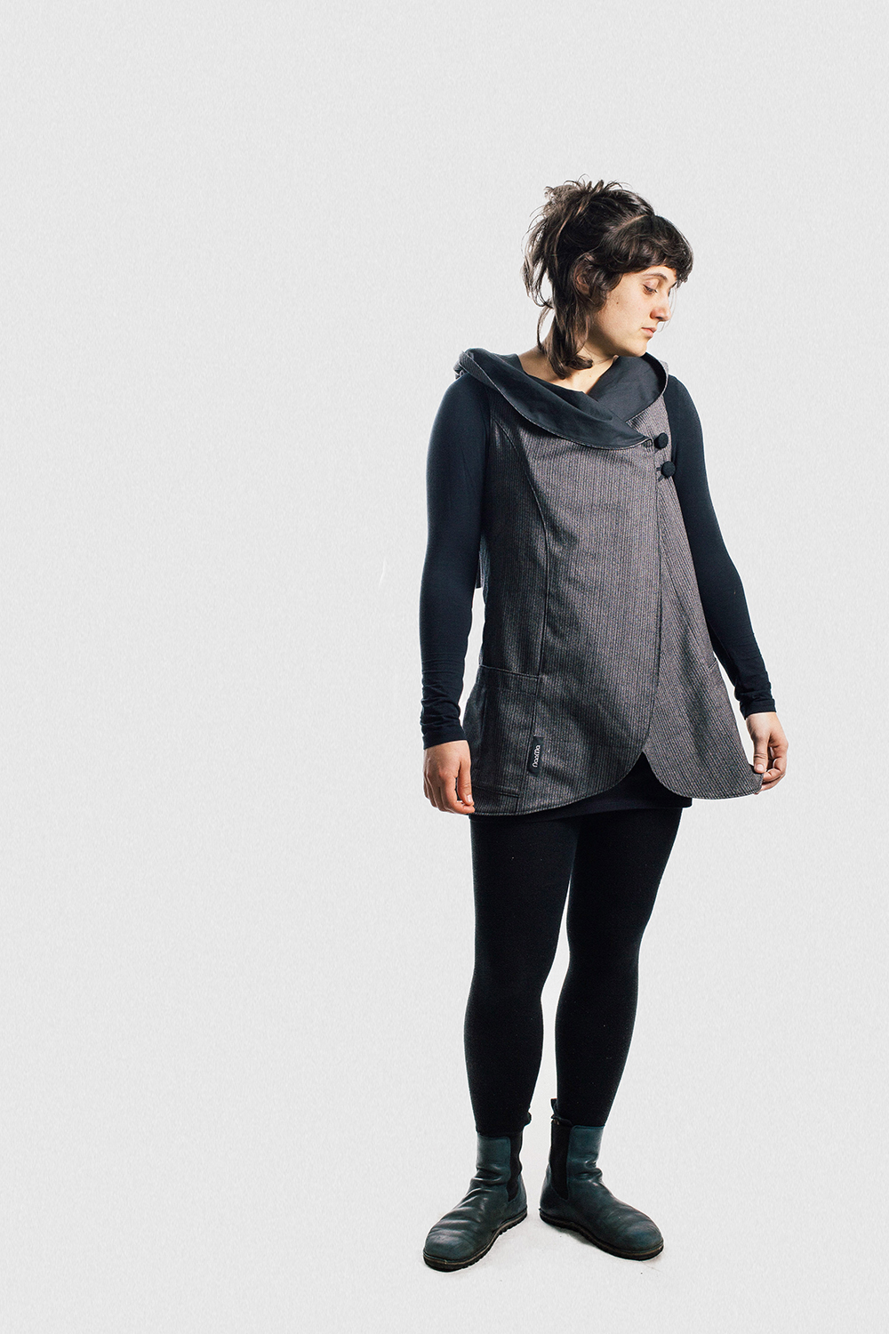 Bei unseren Oberteilen arbeiten wir nicht nur nach streng mathematischen Schnitten, sondern drapieren, anhand von Entwürfen, auch an der Puppe. Diese Herangehensweise ermöglicht mehr experimentelle Freiheit bei der Gestaltung. So konnten wir über die Zeit verschiedenste Ideen umgesetzt, die im Gegensatz, zu unseren primär funktionell ausgelegten, Pullovern eher das Design in den Vordergrund stellen.